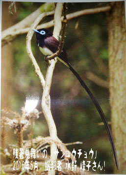 「うれしい気持ちでいっぱいです」のコメント、新しいカメラレンズでドキドキしながらやっと撮った傑作 とか、最新の画像!うれしさが伝わってきます。拍手喝采です!サンコウチョウも喜んでいます。し・あ・わ・せ・の一瞬 2016年5月 撮影:水野 峰子さま(木曽川祖父江野鳥の森を守る会)会員さん